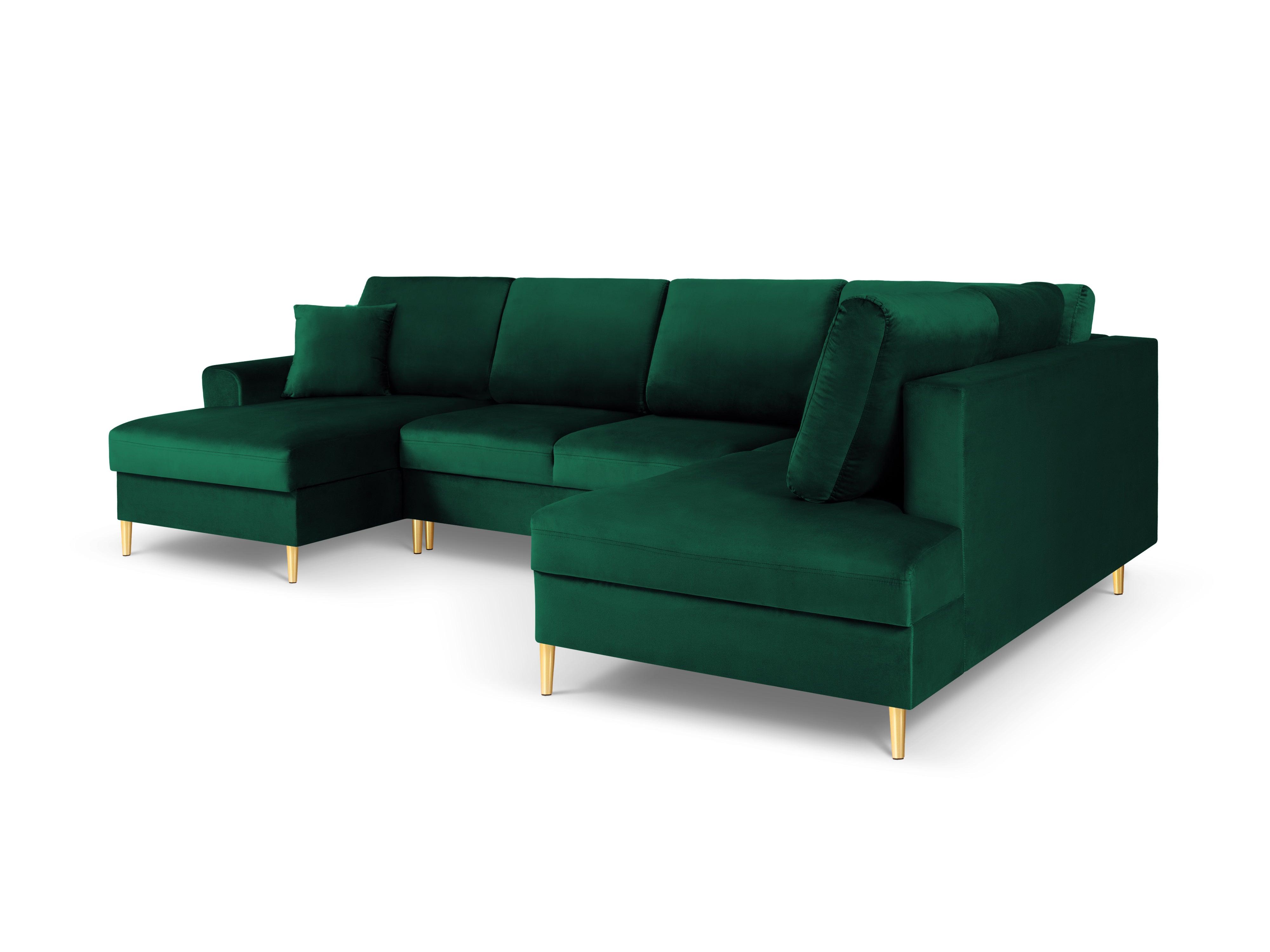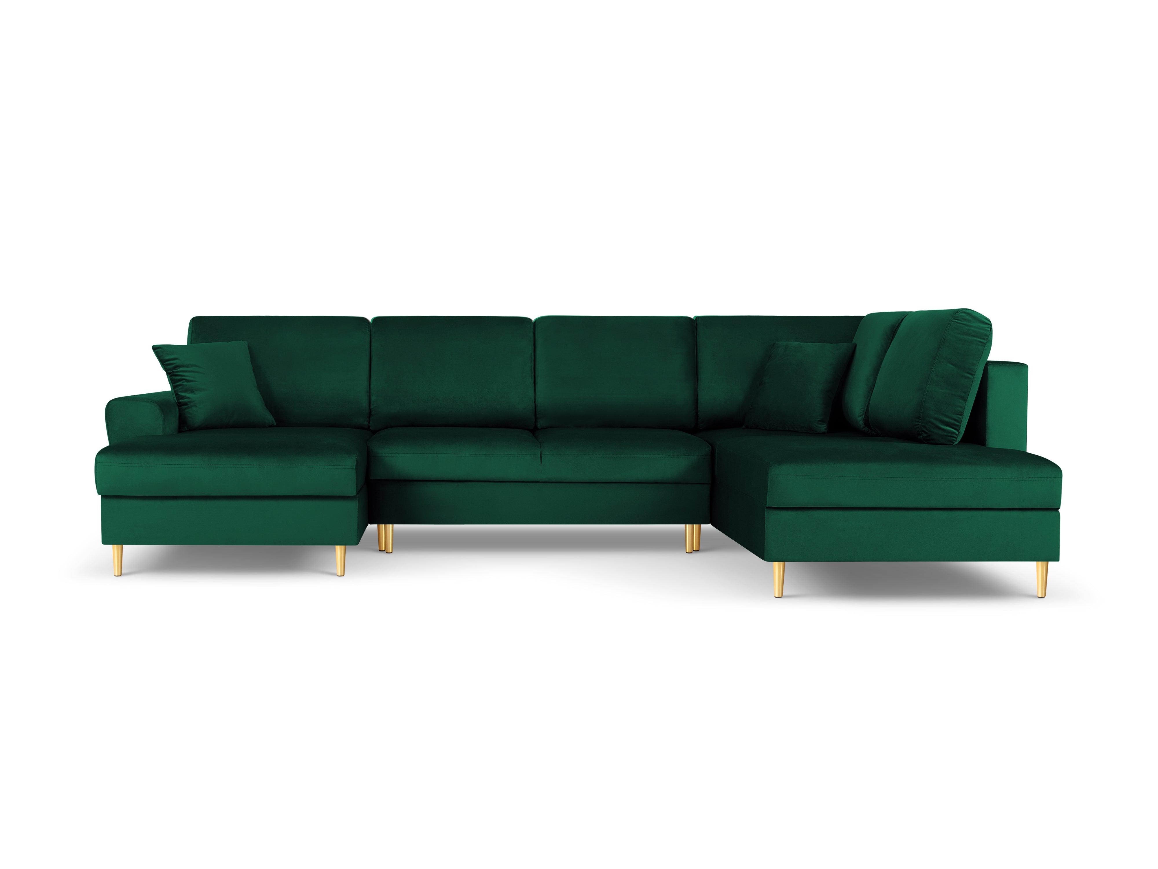Pravostranný rohový pohovka z aksamitného materiálu panoramatický s funkciou spania KYOTO fľašková zelená so zlatým podstavcom