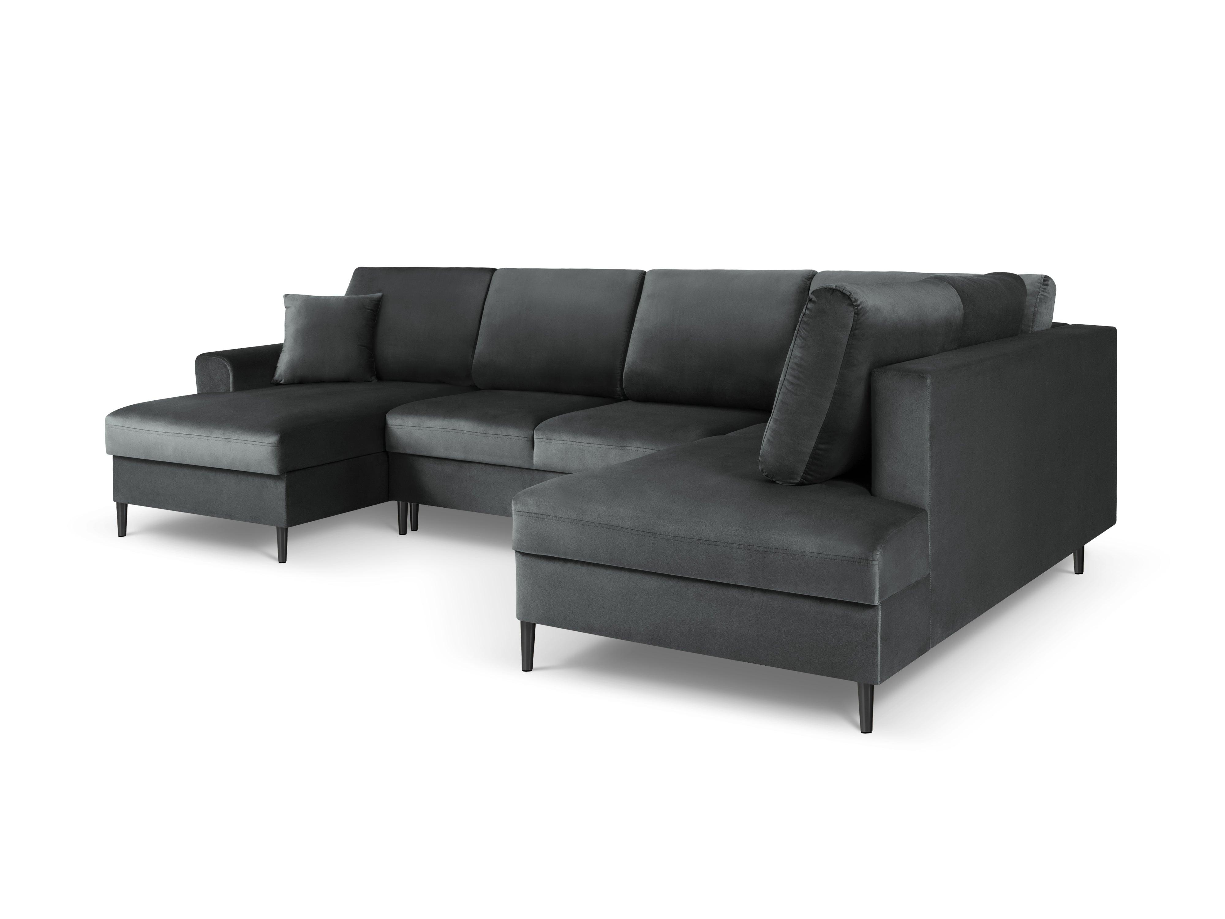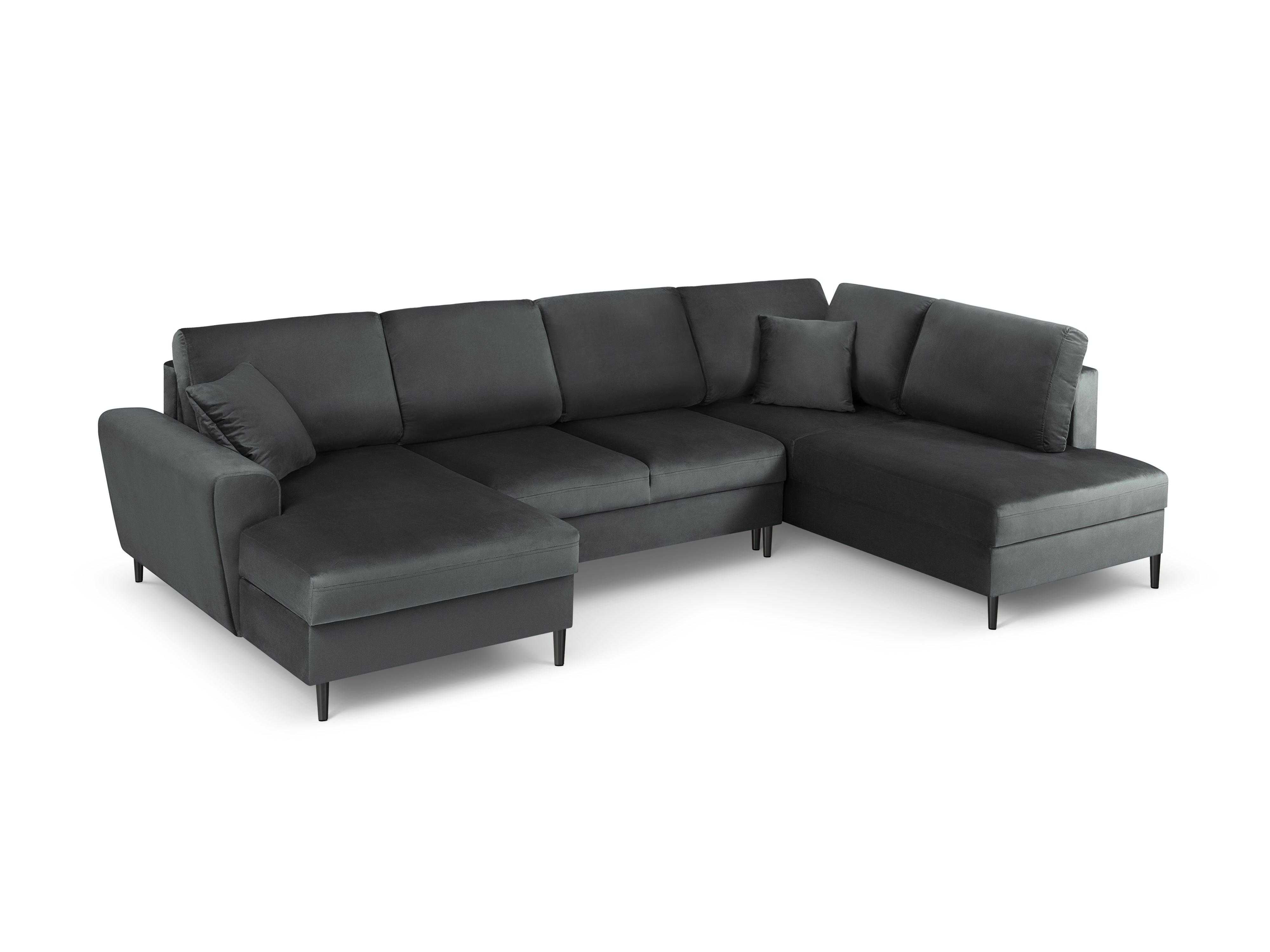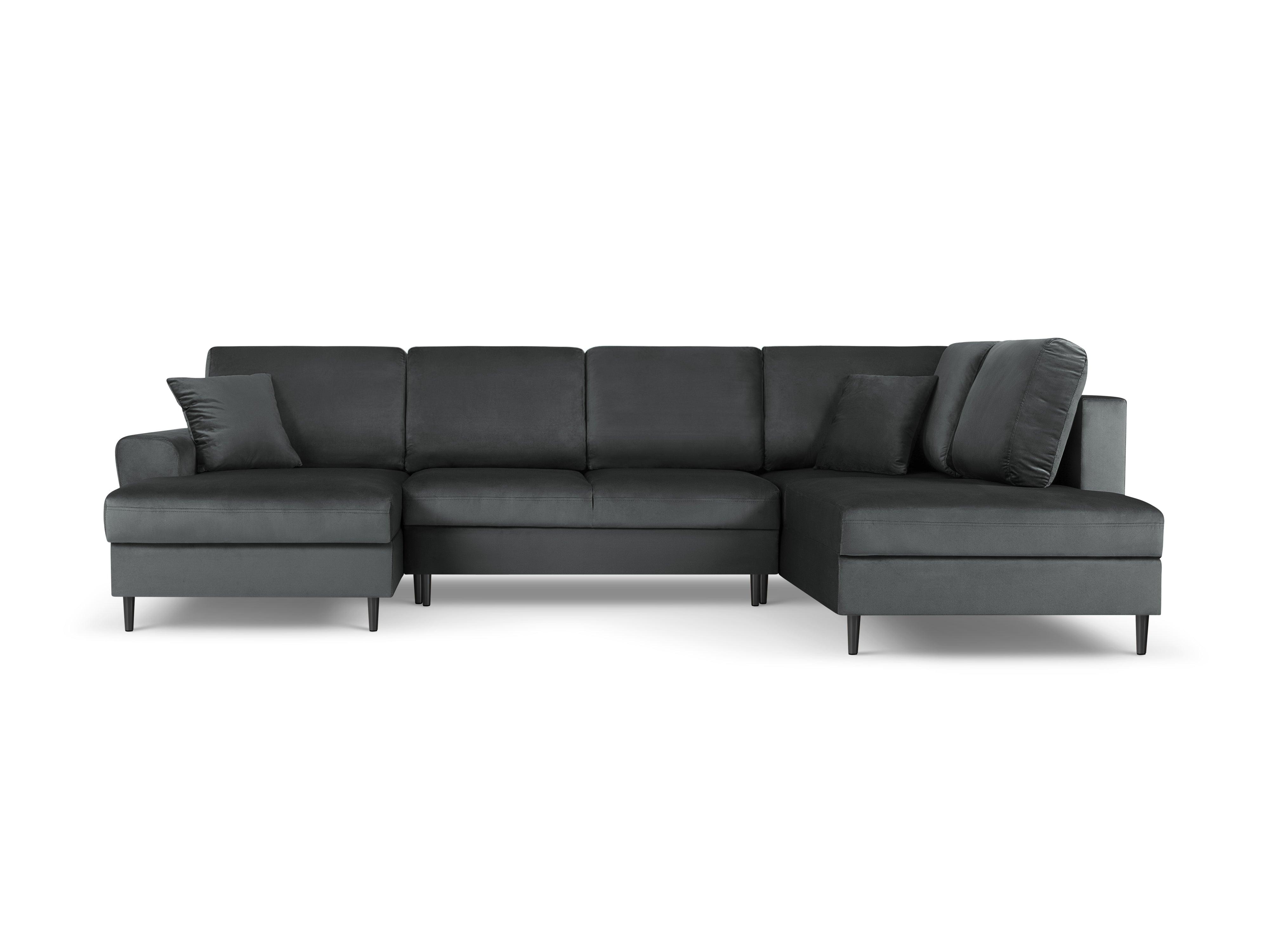 Pravostranný rohový pohovka z aksamitného materiálu panoramatický s funkciou spania KYOTO tmavosivý s čiernym podstavcom