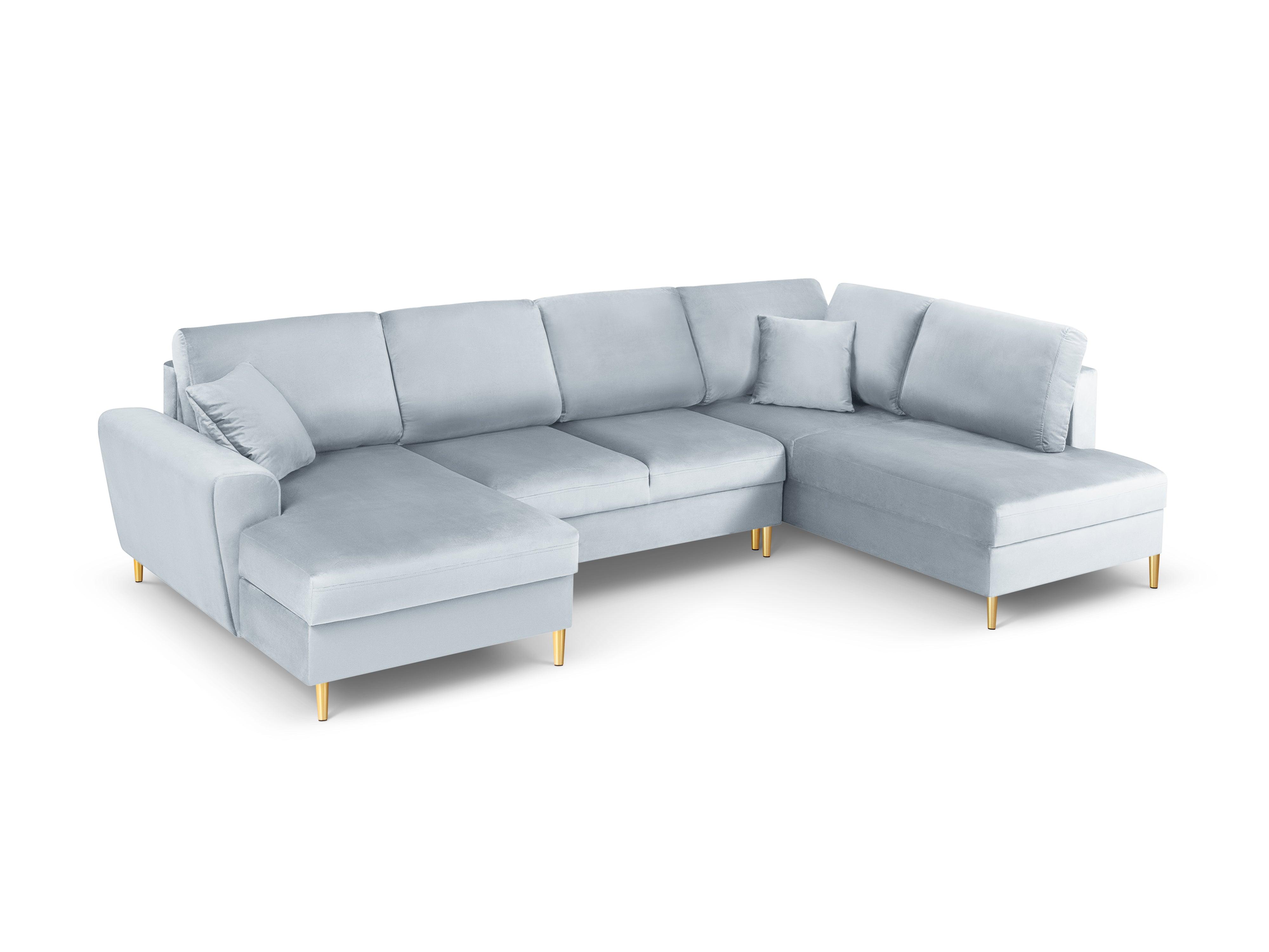 Pravostranný rohový pohovka z aksamitného materiálu panoramatický s funkciou spania KYOTO svetlomodrý so zlatým podstavcom