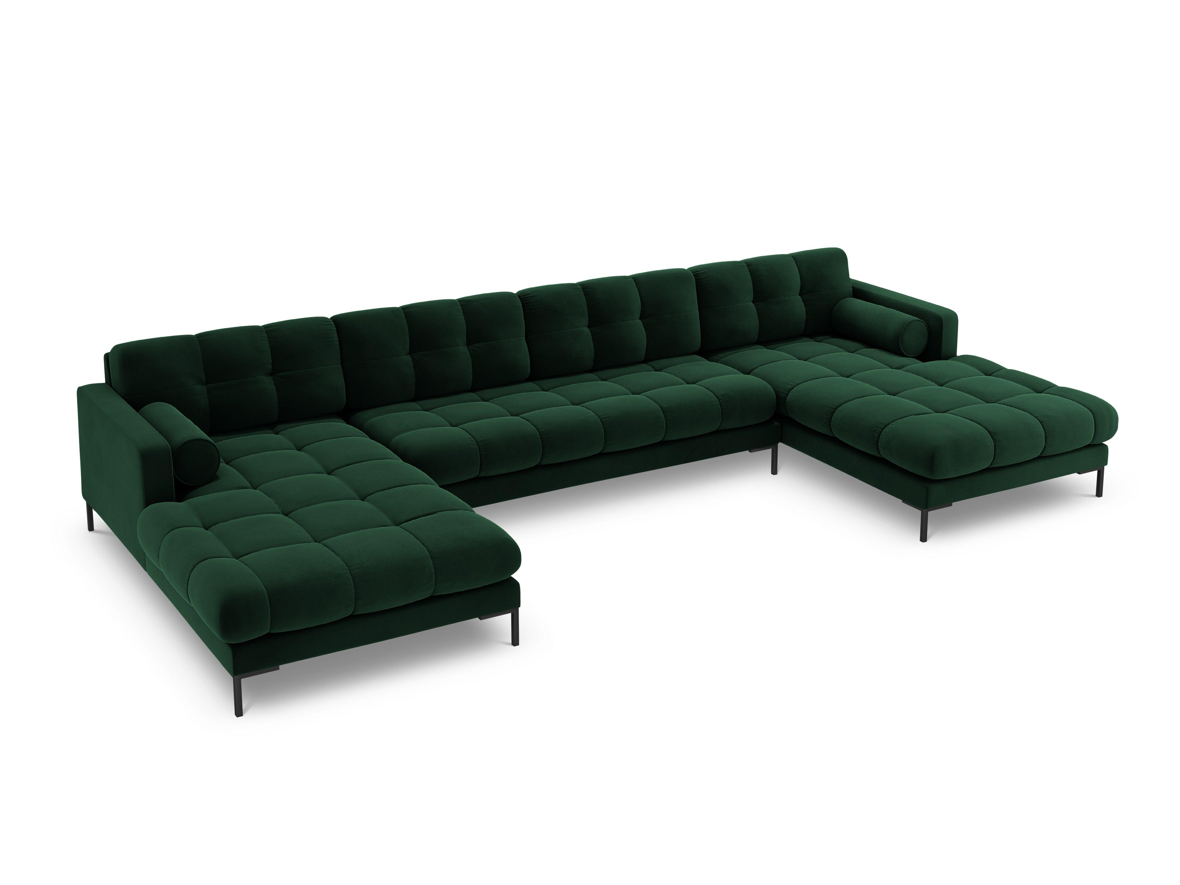 Sametový rohový gauč v tvare U BALI fľaškovozelený s čiernym podstavcom