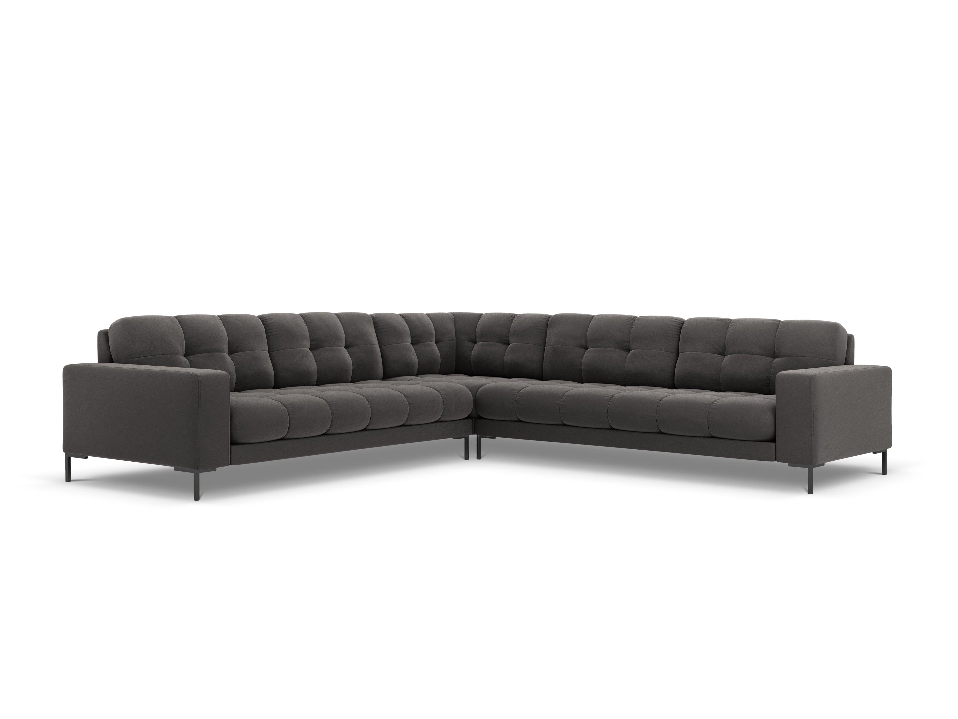 Súmerný sametový rohový gauč BALI tmavosivý s čiernym podstavcom