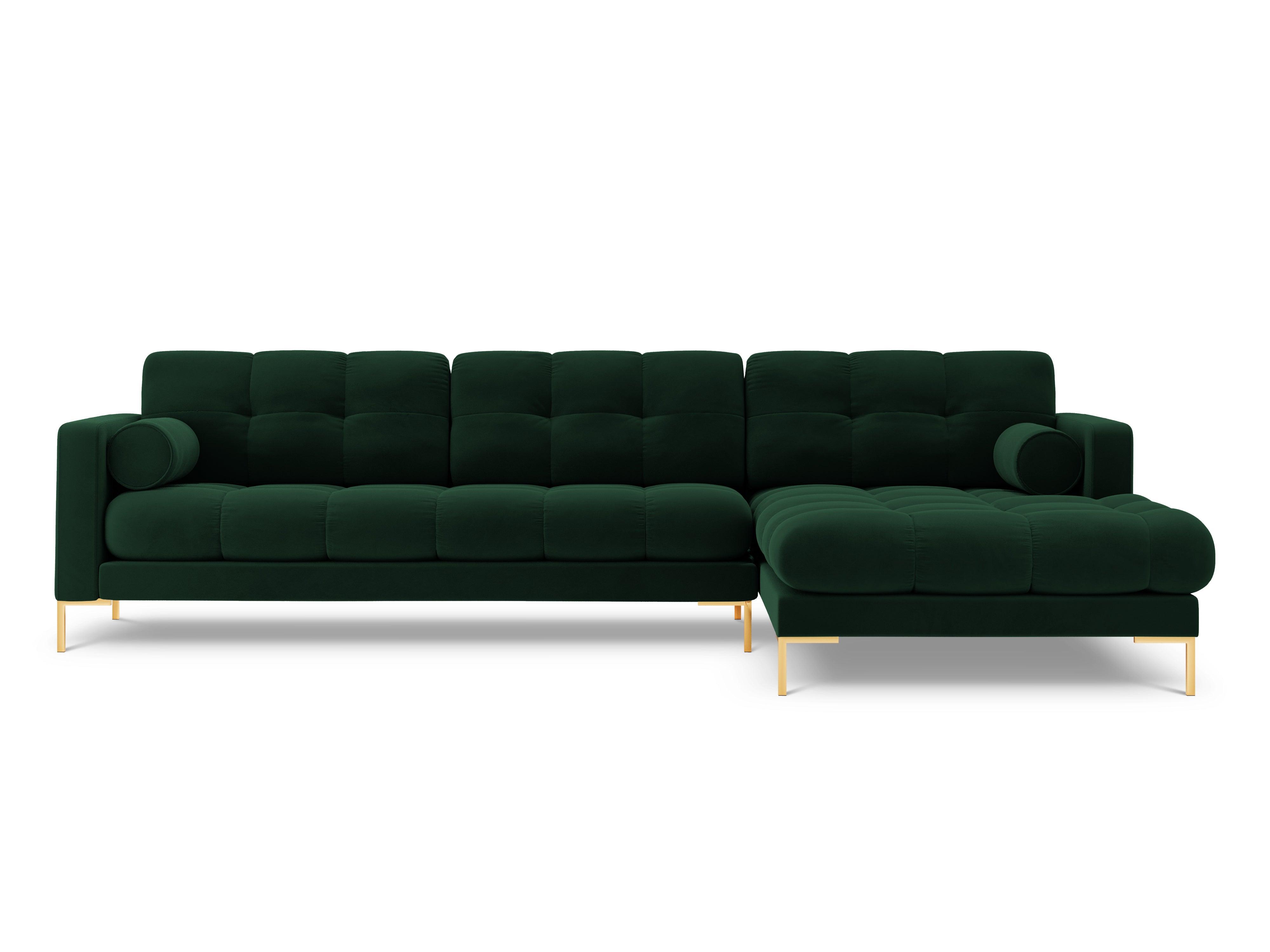 Rohová sedačka z jemného sametu pravostranná BALI v odtieni fľaškovozelenej so zlatým podstavcom