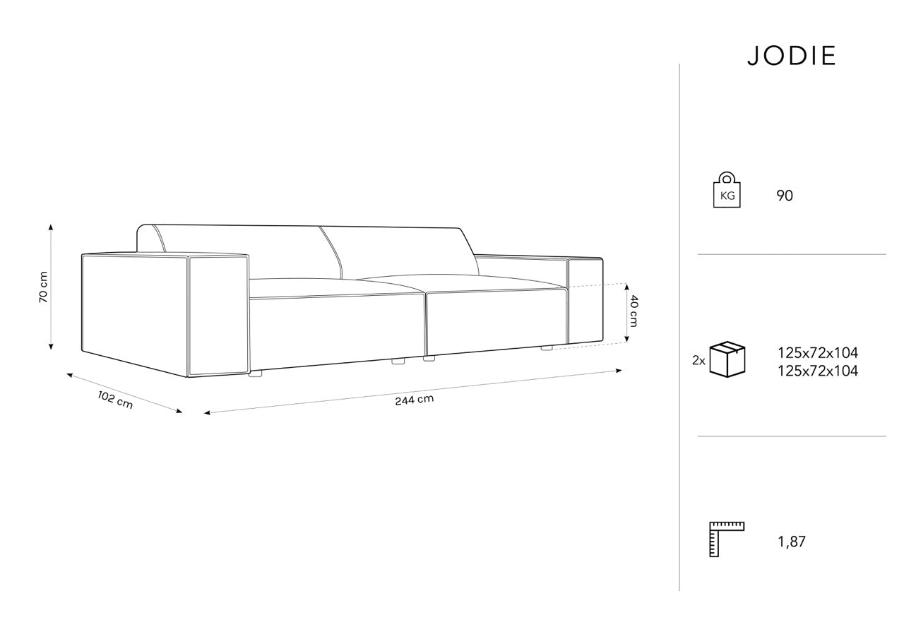 Rohová sedačka pre štyri osoby Jodie nie je len pohodlné sedenie, ale aj prvok interiéru, ktorý pridáva eleganciu do vášho domova. Je vyrobená z kvalitnej zamatovej tkaniny, čo zaručuje nielen vynikajúce pohodlie, ale aj dlhú životnosť nábytku. Pohodlné sedenie a opierka poskytujú vynikajúce podmienky na relaxáciu a oddych, a široké podrúčky umožňujú pohodlné ležanie a oporu rúk.