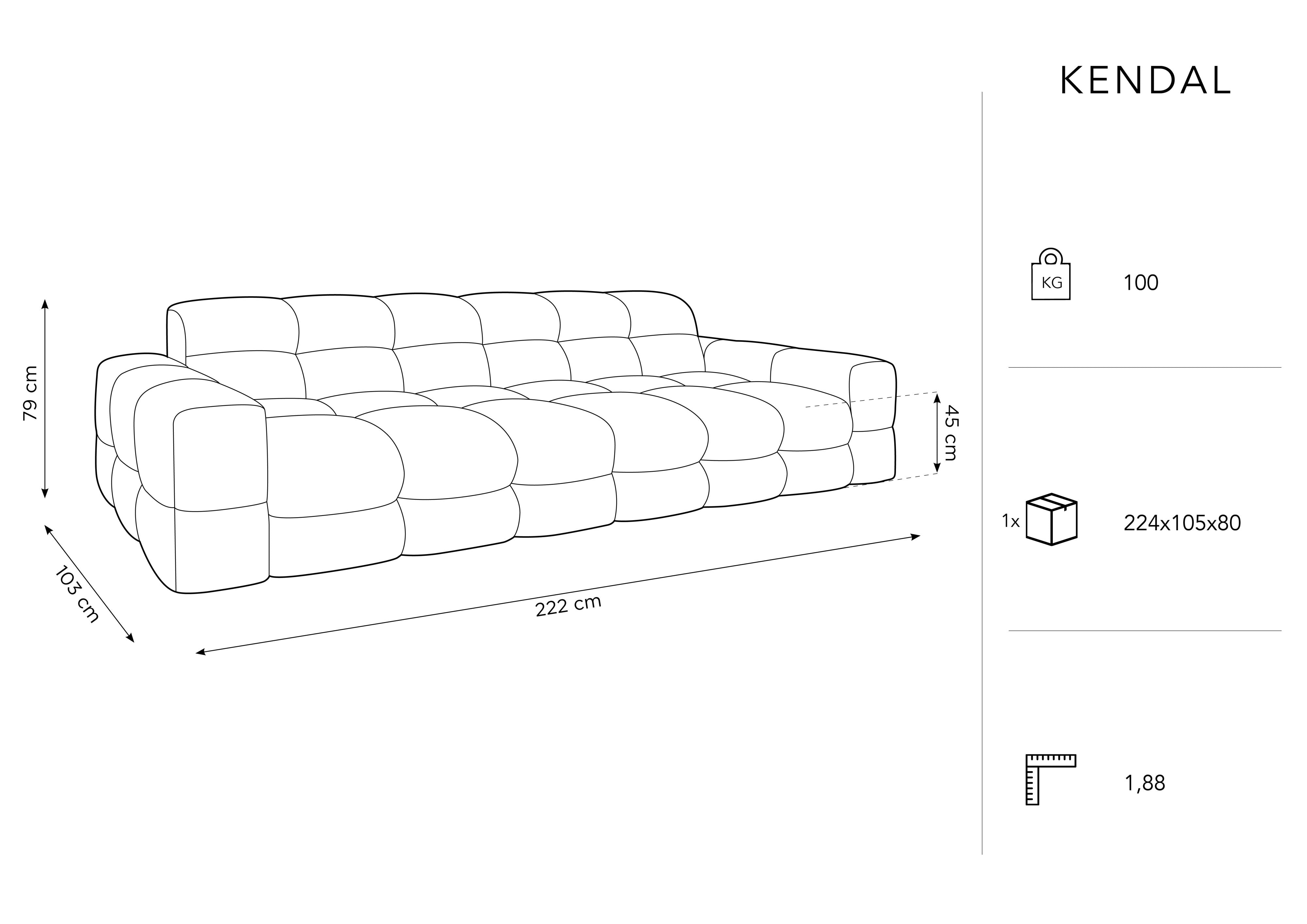 Sametová pohovka pre tri osoby Kendal očarí svojimi jedinečnými prešívaniami a prekladaním, ktoré dodajú interiéru výnimočnú eleganciu v štýle moderný klasický. Bublinkové sedadlo v kombinácii so širokými opierkami rúk a štýlovým operadlom vytvára pohodlné miesto na relaxáciu po náročnom dni.Kendal prekvapuje trochu avantgardnou formou a priťahuje pozornosť, bez ohľadu na to, z ktorej strany sa na ňu pozrieme.