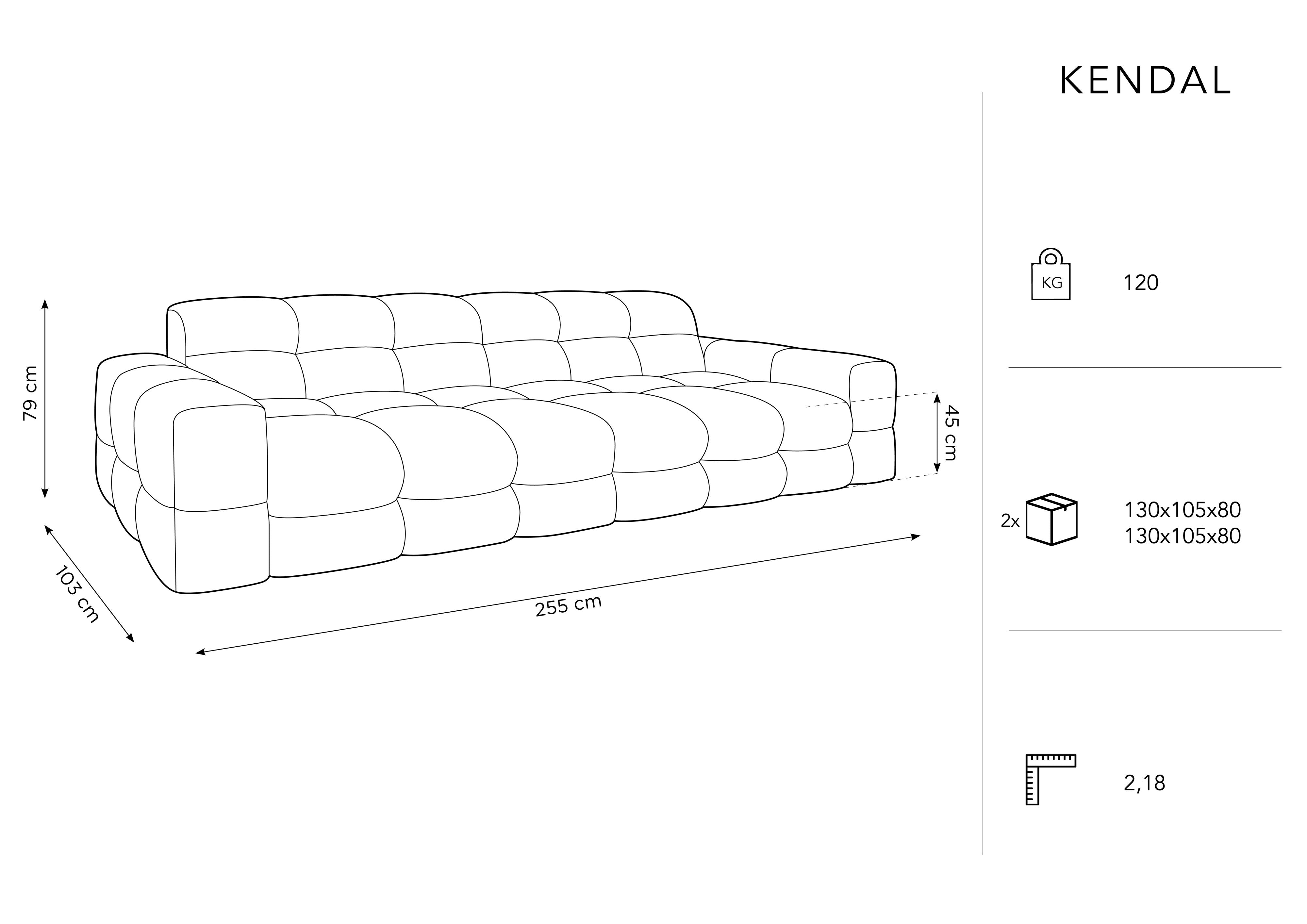 Sametová pohovka pre štyri osoby Kendal očarí svojimi jedinečnými prešívaniami a prekladaním, ktoré dodajú interiéru výnimočnú eleganciu v štýle moderný klasický. Bublinkové sedadlo v kombinácii so širokými opierkami rúk a štýlovým operadlom vytvára pohodlné miesto na relaxáciu po náročnom dni.Kendal prekvapuje trochu avantgardnou formou a priťahuje pozornosť, bez ohľadu na to, z ktorej strany sa na ňu pozrieme.