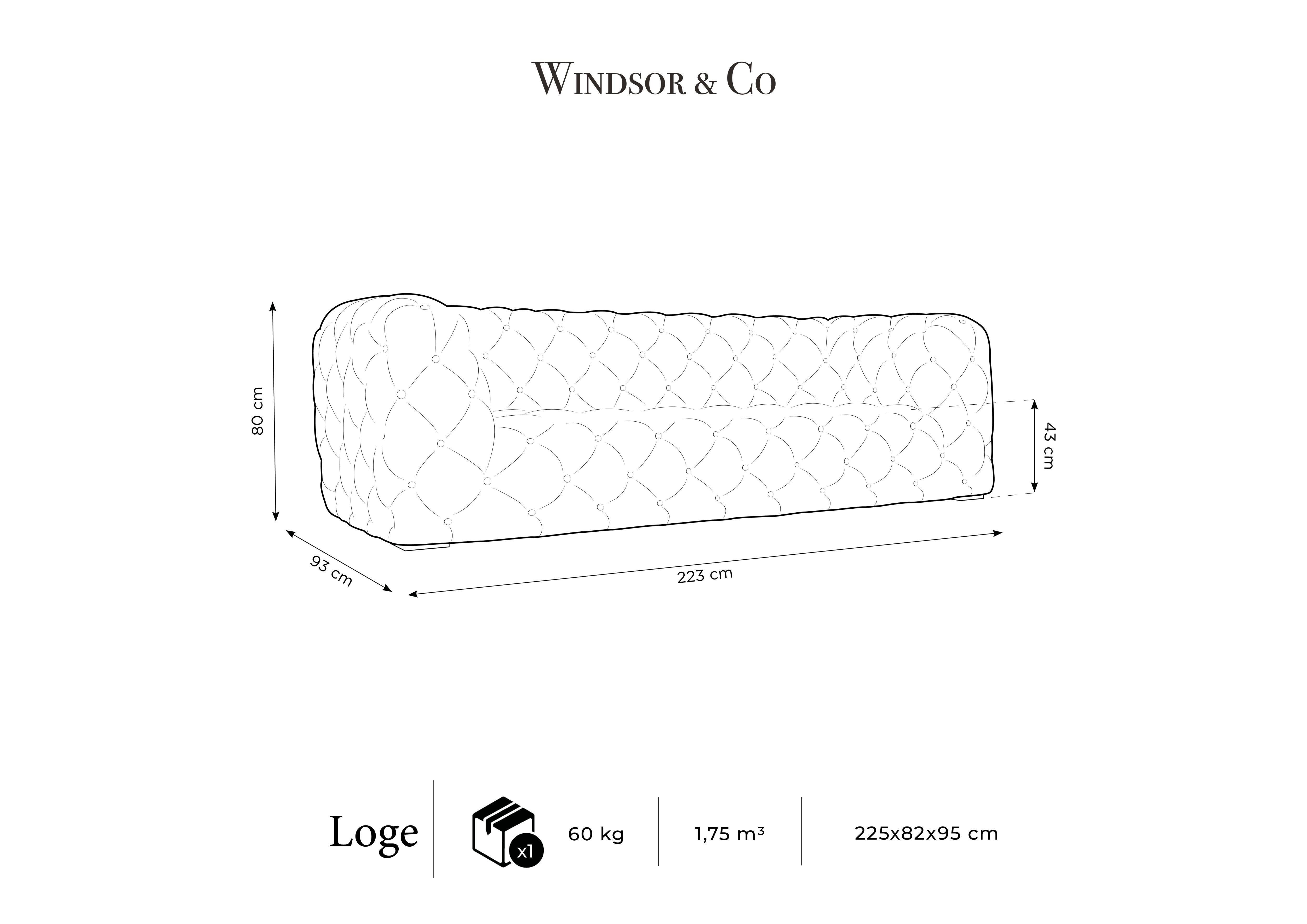 Sametová pohovka pre tri osoby Loge je výnimočná kombinácia klasickej formy s nádychom luxusu. Nezvyčajný dizajn vynikne v každom obývacom priestore a prinesie do miestnosti kúsok elegancie. Hlboké prešívanie a dodatočné švy v tvare štvorcov sú zvýraznené dekoratívnymi gombíkmi.