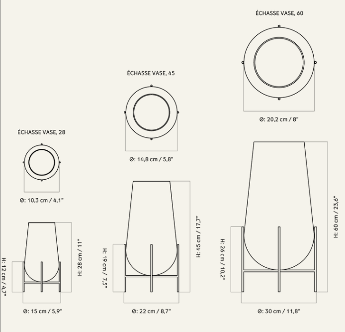 Váza Échasse Vase, prvý projekt z tejto ikonickej série, bola inšpirovaná laboratórnymi skúmavkami. Jej jemné, zaoblené línie a zužujúci sa tvar smerom nahor vytvárajú dojem harmónie a rovnováhy. Vyrobená z dymového skla usadeného na brúsených mosadzných nohách, predstavuje elegantný akcent v moderných aj klasických interiéroch. Váza je dostupná aj vo verzii s priehľadným sklom a bronzovými nohami, ideálna do menších priestorov. Krásna ako s kvetmi, tak aj ako sochársky dekoratívny prvok, Échasse vnáša do priestoru pocit ľahkosti a rafinovaného štýlu.