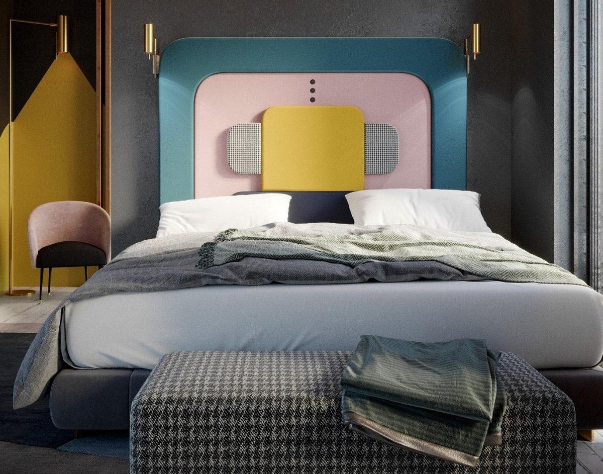 Wezgłowie z kolekcji Plum to nietuzinkowy projekt Katarzyny Jasyk, który swoją kompozycją i bryłą nawiązuje do postmodernistycznego stylu Memphis. Połączenie odważnych kolorów i geometrycznych form tworzy przyciągający uwagę, niepowtarzalny projekt. Całość obito miękką, aksamitną tkaniną, która dodaje subtelności i elegancji.