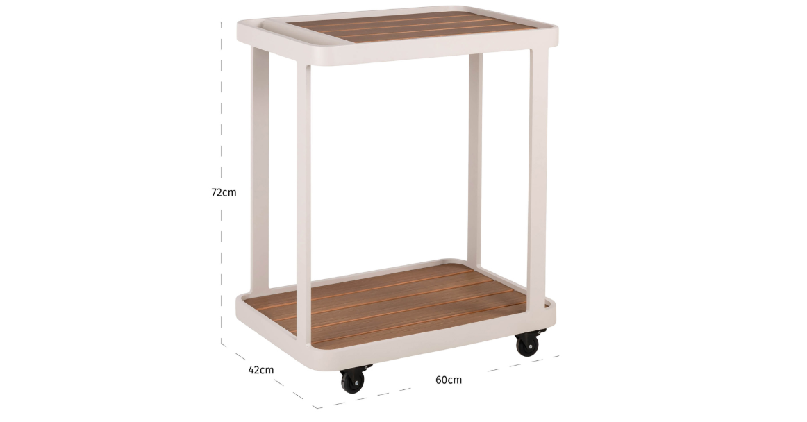 Záhradný vozík Spritz spája funkčnosť s elegantným dizajnom. Kovová konštrukcia s prírodným dreveným vrchom vytvára jedinečný kus nábytku, ktorý je ideálny na servírovanie nápojov alebo občerstvenia na čerstvom vzduchu. Jeho praktický dizajn robí z neho vynikajúci doplnok na terasu, do záhrady alebo na balkón, pričom zároveň vnáša štýlový akcent do vonkajšieho priestoru.