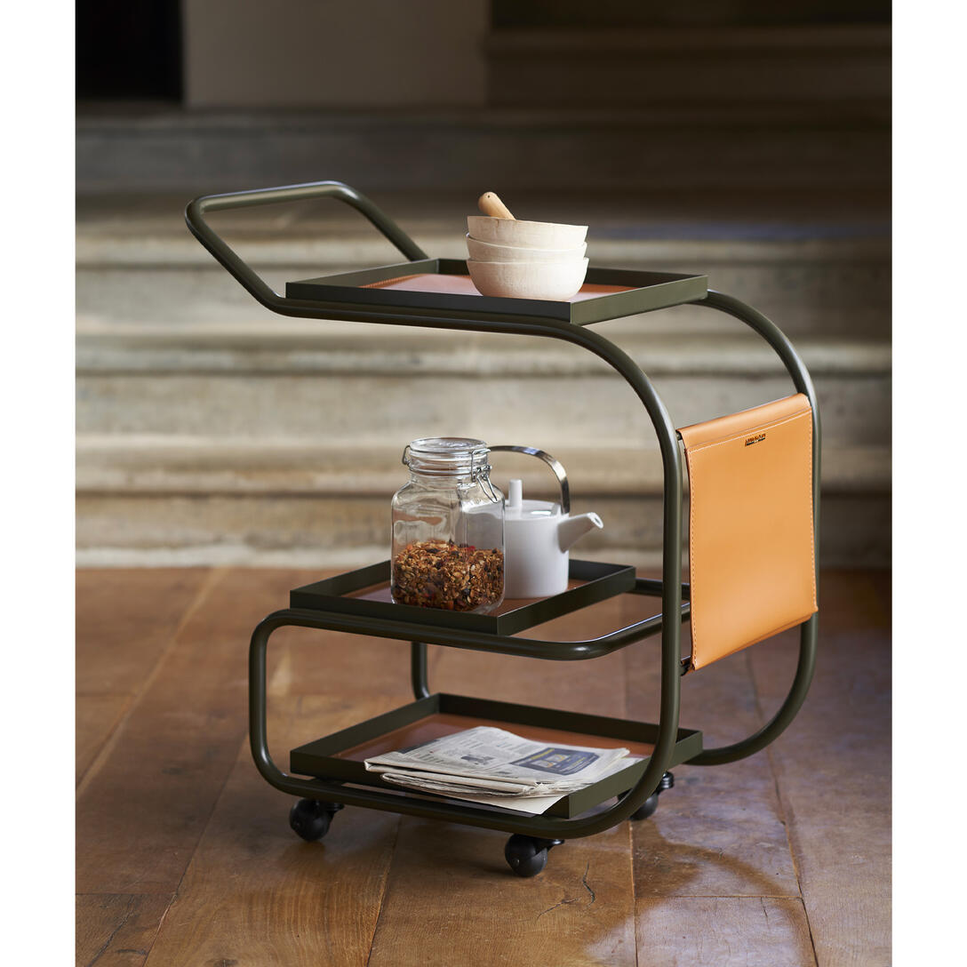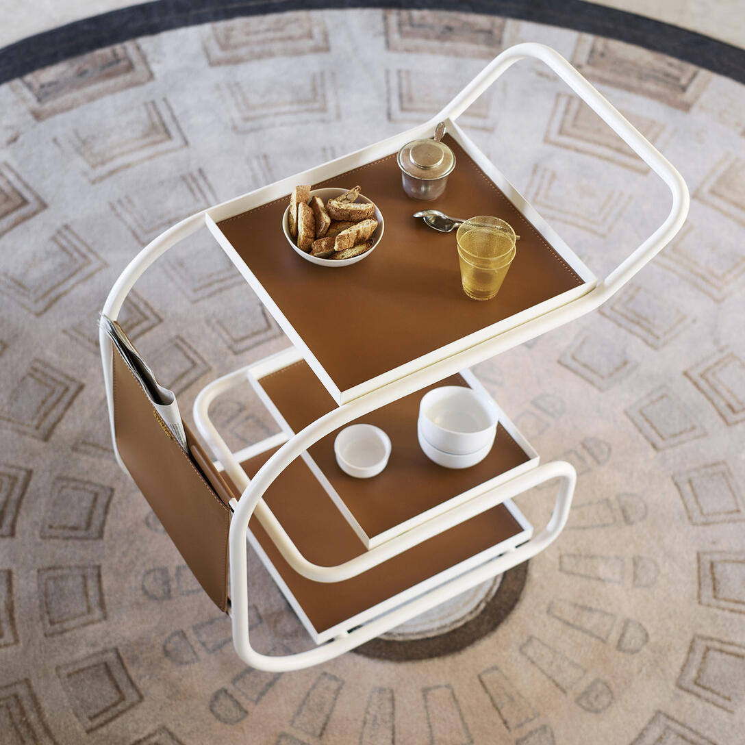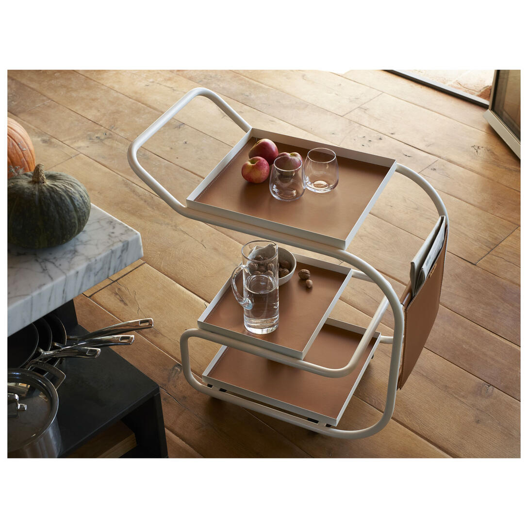 Zenzero je dizajnový barový vozík, ktorý očarí svojou funkčnosťou a rafinovanou formou. Projekt od Samera Alameena spája modernú oceľovú konštrukciu s tromi praktickými podnosmi – dva z nich sú vyberateľné – a priestrannou kapsou z regenerovanej kože. Otočné kolieska a ergonomická rukoväť zabezpečujú, že nábytok je plne mobilný a pripravený sprevádzať vás v každej miestnosti – od kuchyne po obývačku, od kancelárie po exkluzívny lounge.
