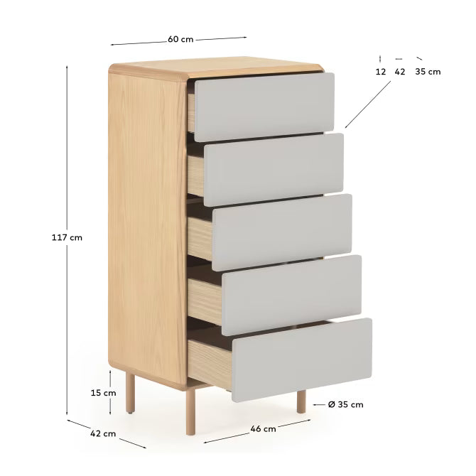 Komoda so zásuvkami Anielle je elegantný a nadčasový kus nábytku, ktorý spája prirodzené teplo jaseňového dreva s moderným, šedo-bielym povrchom lakovaných čel. Jej jemné, zaoblené línie a harmonická forma dodávajú interiéru pokoj a subtílnu ľahkosť. Táto drevená komoda bola navrhnutá tak, aby zabezpečila pohodlie pri každodennom používaní, pričom predstavuje štýlový dekoratívny prvok, ktorý sa skvele hodí do moderných, škandinávskych a minimalistických aranžmánov.