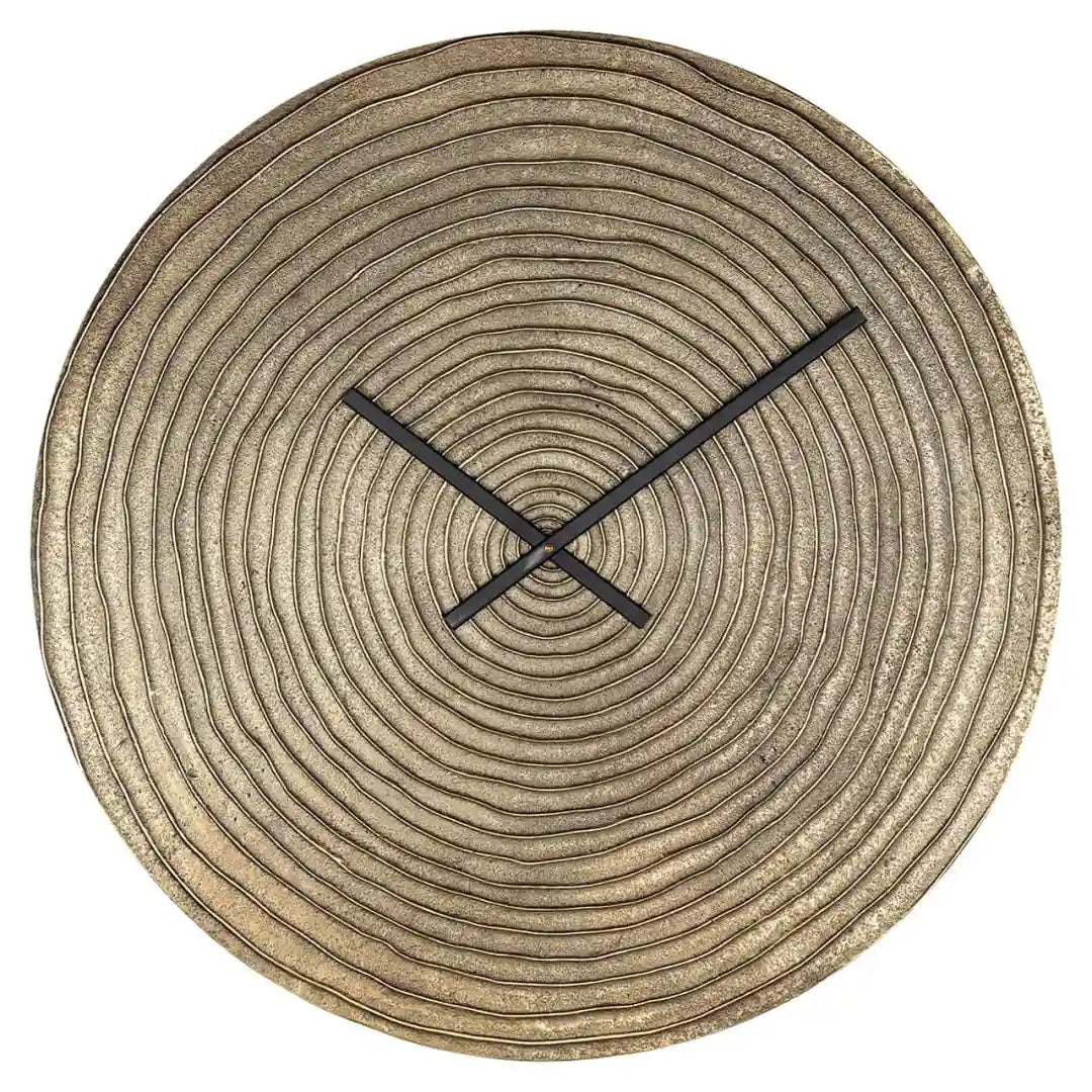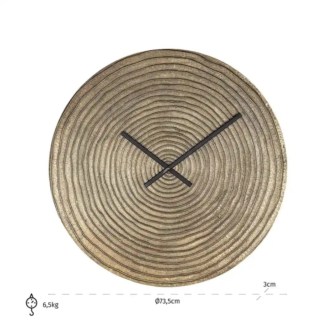 Nástenné hodiny Roan v zlatej farbe sú výraznou dekoráciou, ktorá do interiéru vnesie nádych luxusu a modernosti. Jeho povrch zdobený koncentrickými kruhmi pripomína štruktúru dreva, čo mu dodáva výnimočný, organický charakter. Štíhle, čierne ručičky krásne kontrastujú so zlatým pozadím, vďaka čomu je čas čitateľný a samotné hodiny sa stávajú dekoratívnym centrálnym bodom na stene.
