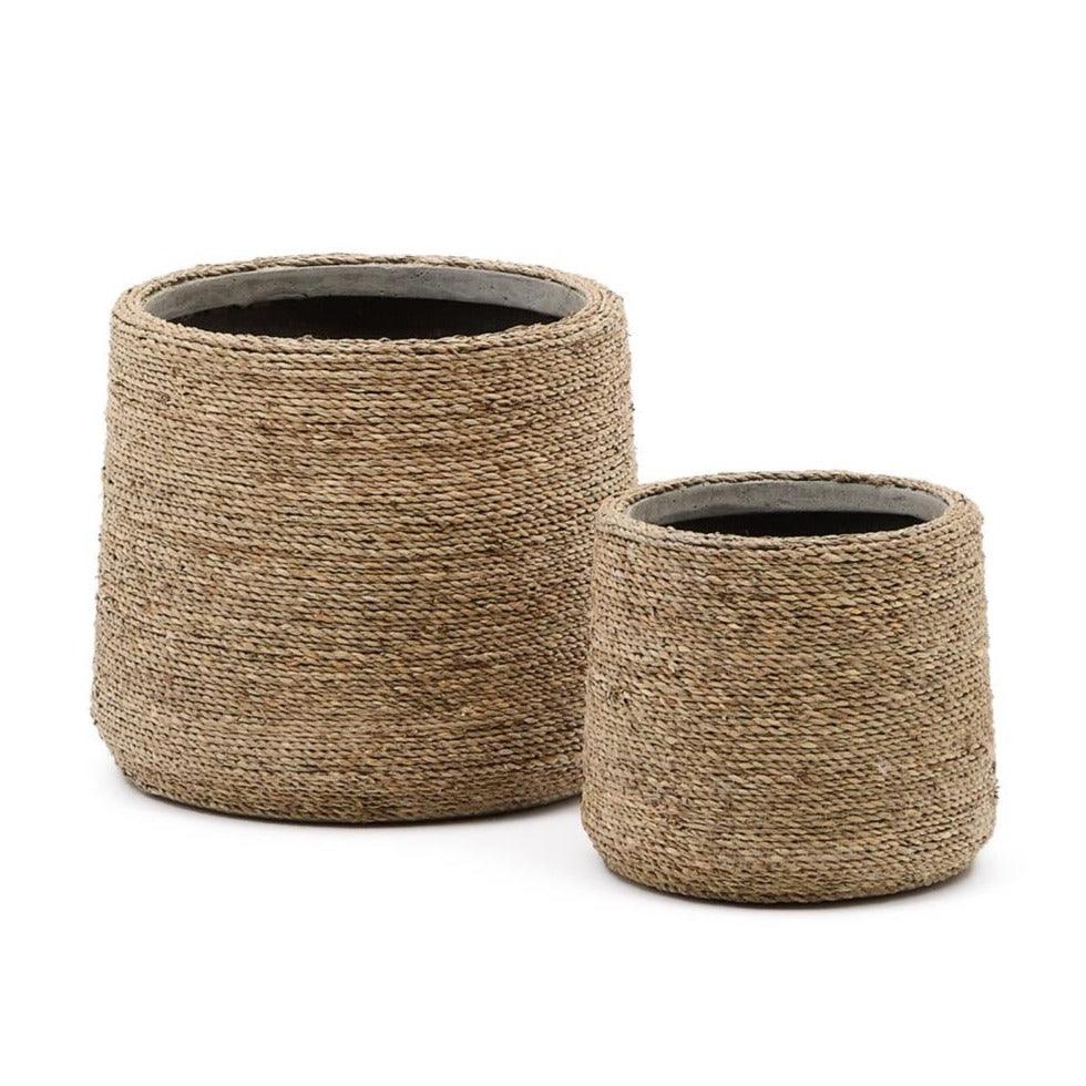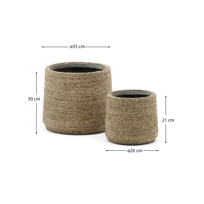 Súprava kvetináčov Sigal je vynikajúcim spôsobom, ako poskytnúť vašim rastlinám prirodzené prostredie a jedinečný vzhľad. Vyrobené z ručne pletenej trávy esparto a s vnútorným povrchom z cementovej pasty, tieto kvetináče sú nielen estetické, ale aj odolné a funkčné.