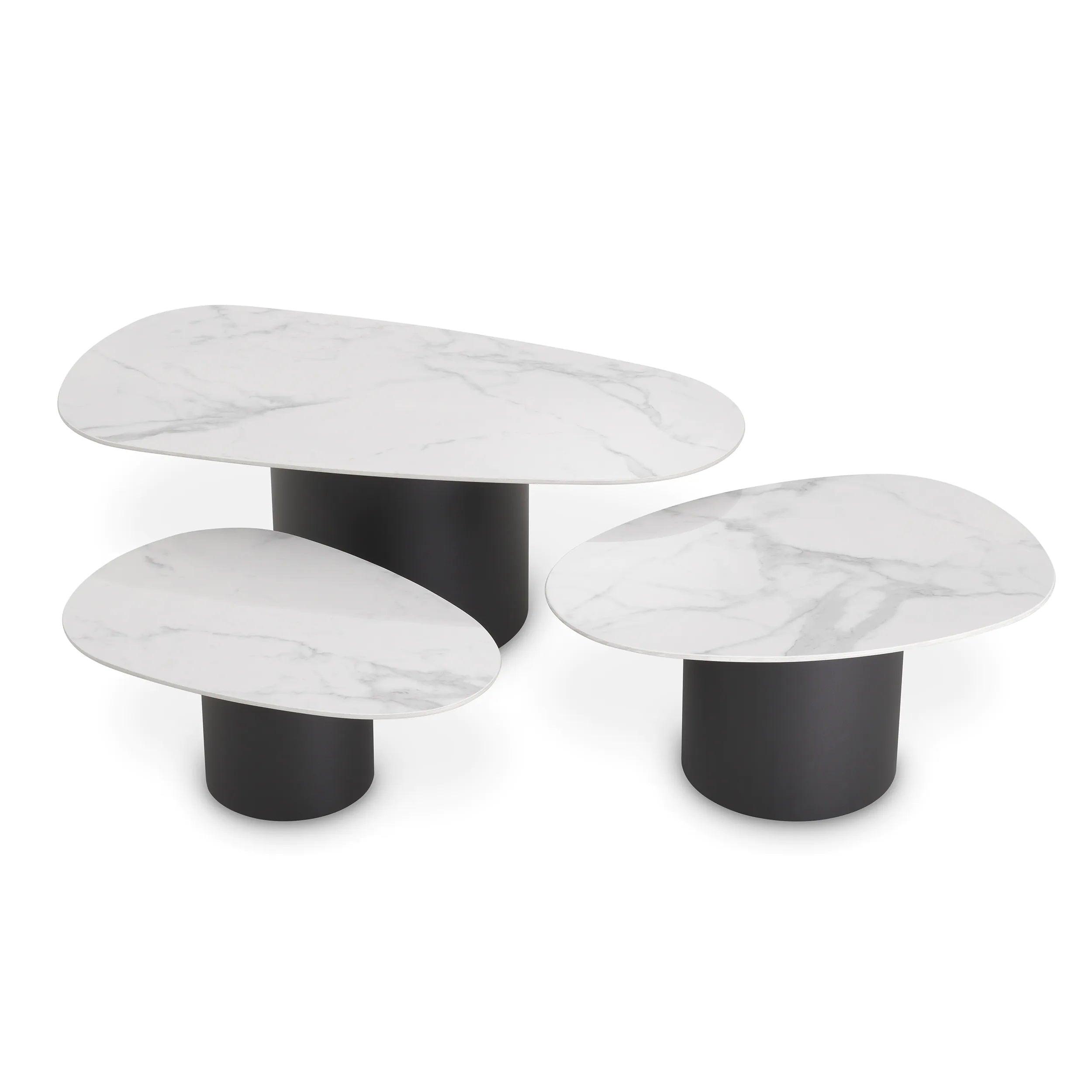 Súprava konferenčných stolíkov Zane je spojenie klasiky a modernosti v jednom. Tri nezávislé prvky, každý s unikátnym tvarom kamienka, ponúkajú nielen funkčnosť, ale aj estetické zážitky. Čierna, cylindrická základňa kontrastuje s bielym, mramorovým povrchom dosky, čo pridáva hĺbku a charakter každému z týchto stolíkov.