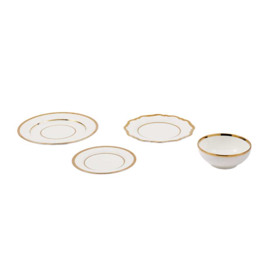 Stolová súprava Golden Finds je ideálne nedopasovaná kolekcia, ktorá vyzerá ako nález z útulného vintage obchodu – ale v luxusnom prevedení. Každý prvok sa líši vzorom, čím vytvára eklektický a plný charakteru celok, ozdobený jemnými zlatými detailmi.
