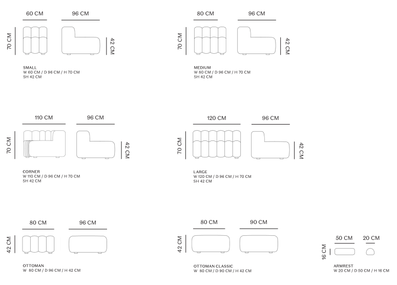 Zestaw składa się z modułu large, modułu medium, modułu corner, modułu small, dwóch otoman, dwóch otoman classic i trzech podłokietników.