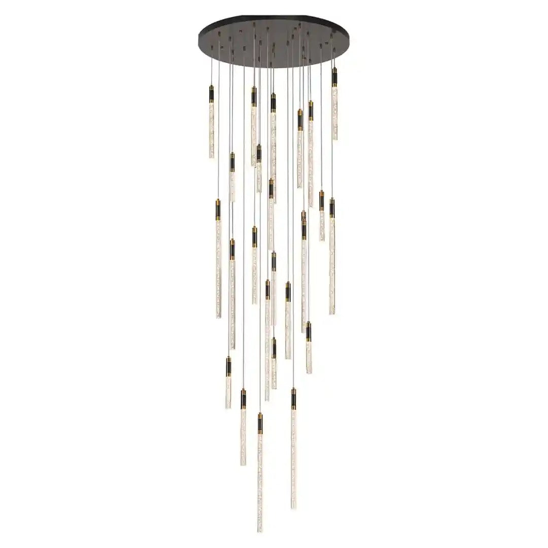 Moderný luster Crosley s impozantnými rozmermi je návrh, ktorý očarí nielen svojou formou, ale aj svetelným efektom. Zložený z 25 štíhlych svetelných zdrojov zavesených v rôznych výškach vytvára mimoriadne efektnú kompozíciu pripomínajúcu svetelný vodopád. Je to ideálne riešenie do vysokých miestností, priestranných obývacích izieb alebo reprezentatívnych hál, kde sa stane centrálnym bodom aranžmán a prinesie výnimočnú atmosféru.